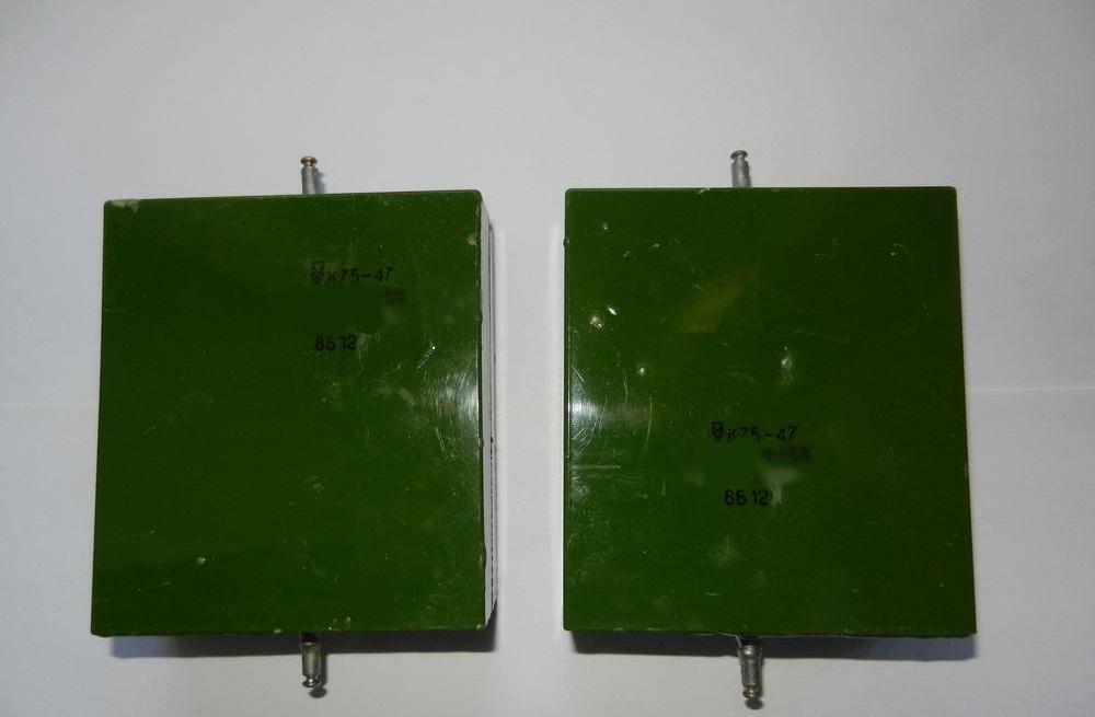 К75-47В 10кв 0,1 мкф конденсатор комбинированный, фольговый, уплотненный, неизолированный, постоянной емкости, предназначен для работы в качестве встроенных элементов внутреннего монтажа аппаратуры (в кожухе комплектного изделия) в цепях постоянного и пульсирующего токов и в импульсных режимах с частичной разрядкой емкости.