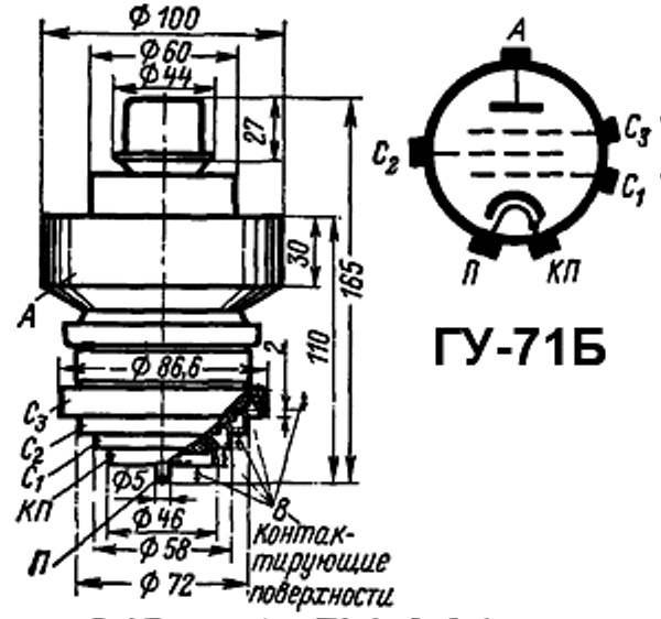 ГУ-71Б генераторный триод относится к разделу электровакуумных приборов и ламп различного назначения. По конструкции генераторный триод состоит из вакуумно-герметичной, жесткой оболочки, внутри которой отсутствует кислород.