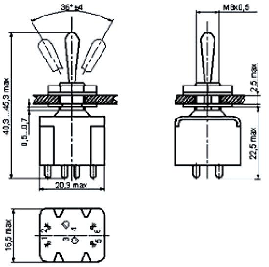 ПТ6-5В переключатель тумблерный, применяется для коммутации цепи сигнализации, питания и управления с напряжением 1х10-4В - 250В, силой тока 1х10-6А - 16А и коммутируемой мощностью до 1900Вт. Тумблеры выполняются с рычажным приводом, позволяющим укреплять резиновый защитный протектор и так и без него. В зависимости от фиксации рычага тумблеры выпускаются с фиксацией в трех положениях, в одном крайнем и среднем положениях и только в среднем положении. Монтаж проводов проводится пайкой.