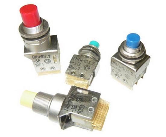 ПКН107-7В переключатель кнопочный с цветной кнопкой, без подсветки, с фиксацией, с одной или двумя группами переключателей предназначены для работы в электрических цепях постоянного и переменного тока в РЭА.