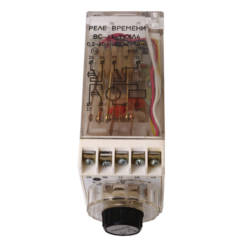 Реле времени ВС-33-1 0,1-60 сек 110В выступающего исполнения с передним присоединением проводов применяется для получения независимой выдержки времени. Реле времени применяется в схемах, где необходимо автоматически выполнить какое-то действие через определенный промежуток времени.
